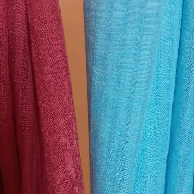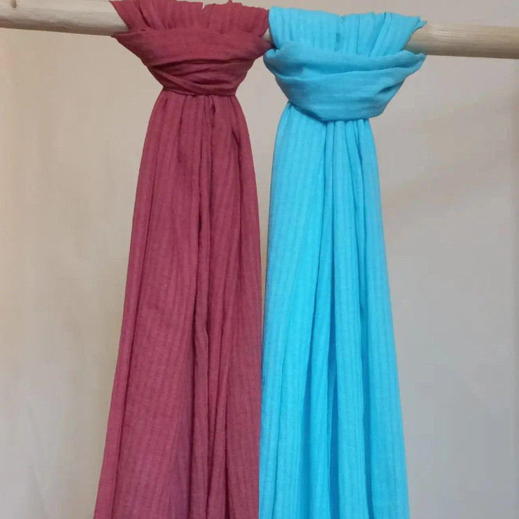 شال وال نخی بسیار سبک و خنک و خوشرنگ بافت پارچه راه راه هست و زیبایی خاصی داره.در دو رنگ آبی اسمانی و آجری.بدون ابرفت و رنگ دهی