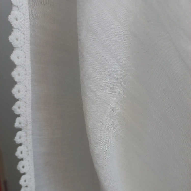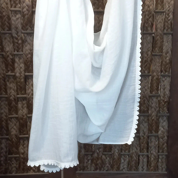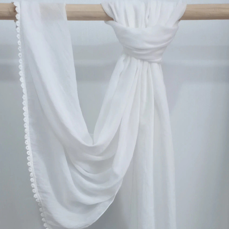 شال وال اسلپ رنگ سفید بسیار سبک و لطیف ایستایی عالی روی سر، دو سمت شال نوار عدسی دوخته شده..شال با نوار طرح گل موحود نیست