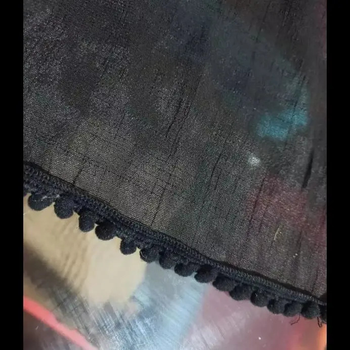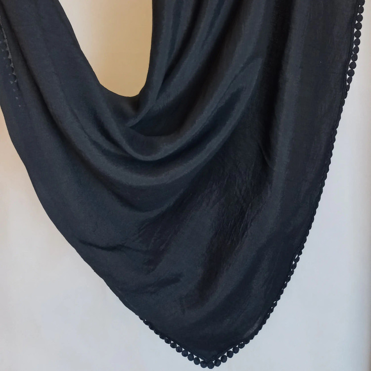 روسری قواره بزرگ رنگ مشکی شسته شده بدون رنگ و آبرفت .دور دوزی شده با نوار پم پم ریز در دو سمت روسری
