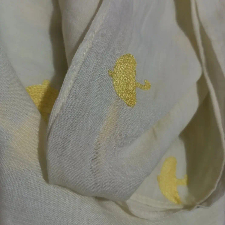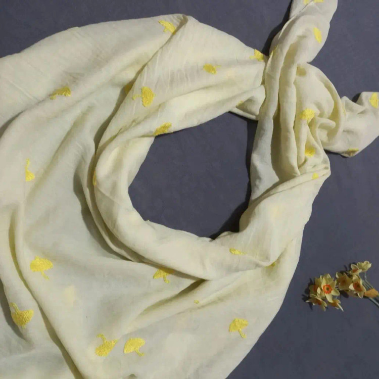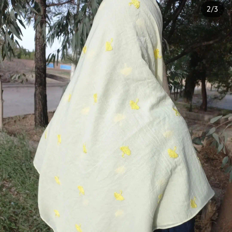 روسری نخی وال خامه دوزی .بسیار سبک و نرم ،لطیف ،ایستایی عالی روی سر داره، گل دوزی شده طرح چتر رنگ لیمویی