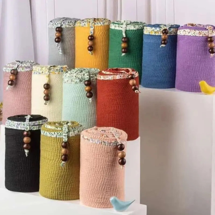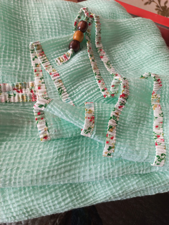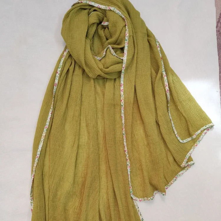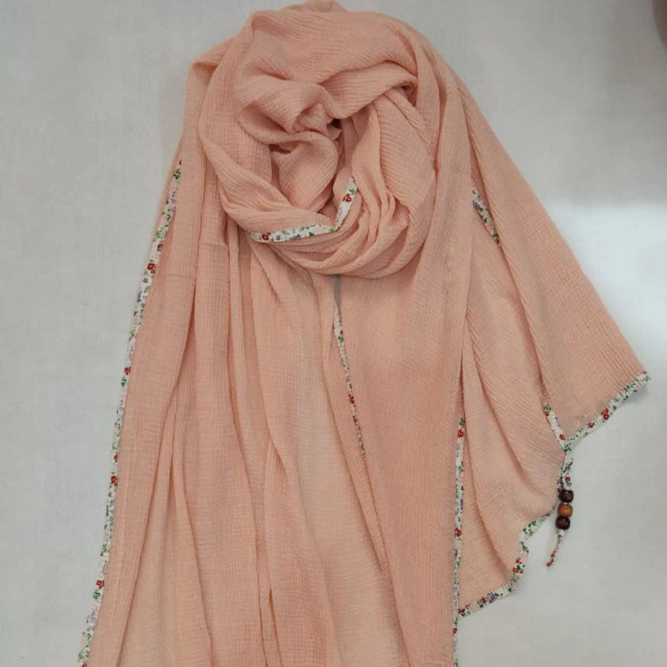 شال پلیسه وار داتی،دور گان .بسیار نرم و لطیف،دور کار نوار اریب گلدار دوخته شده، منگوله دار در ۱۲ رنگ ملایم و جذاب