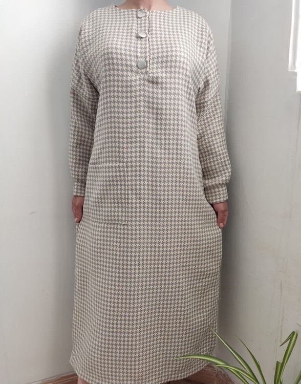 مانتو کفتان بلند .جنس پشمی پیردوپیل.یقه سه دکمه .چاکدار.آستین بلند.قد یک متر و ۳۰.قد آسنین از گودی گردن ۶۰